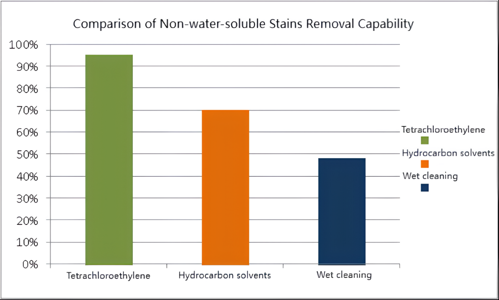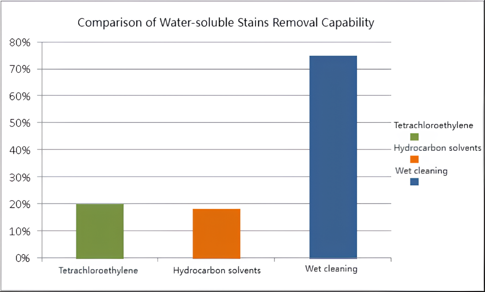 Vådrensning har den stærkeste evne til at fjerne vandopløselige pletter, som kan nå op på 75 %, efterfulgt af tetrachlorethylen og kulbrinte opløsningsmidler.