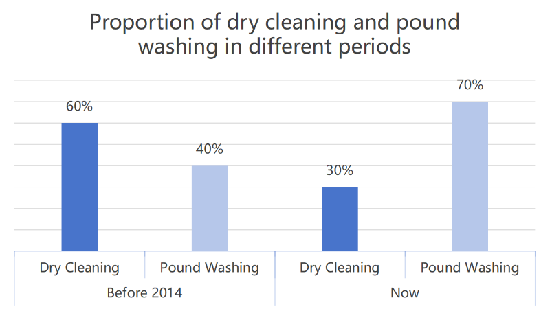 For ti år siden var forholdet mellem kemisk rensning og vask omkring 6:4. Imidlertid er forholdet mellem kemisk rensning og pundvask omkring 3:7 nu.